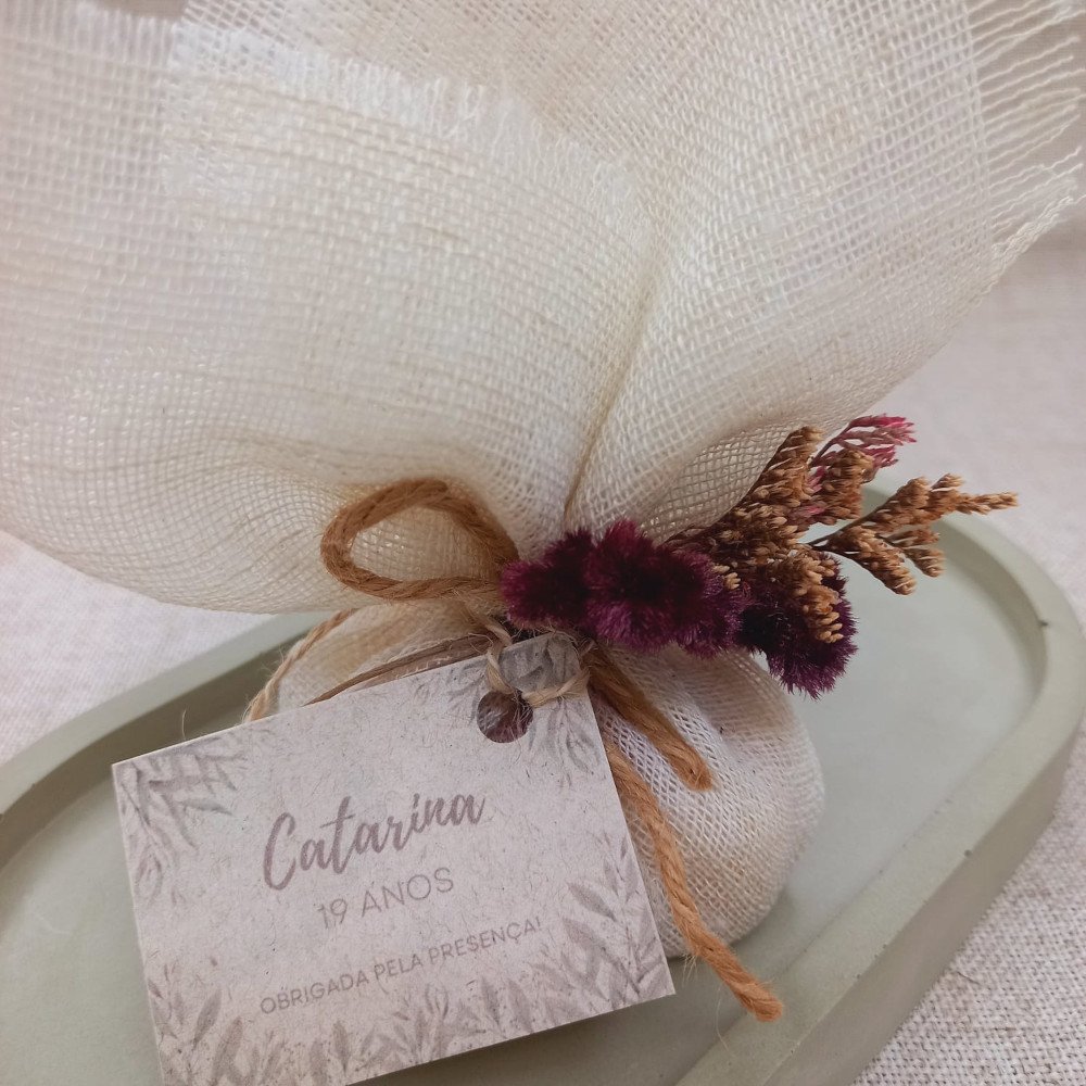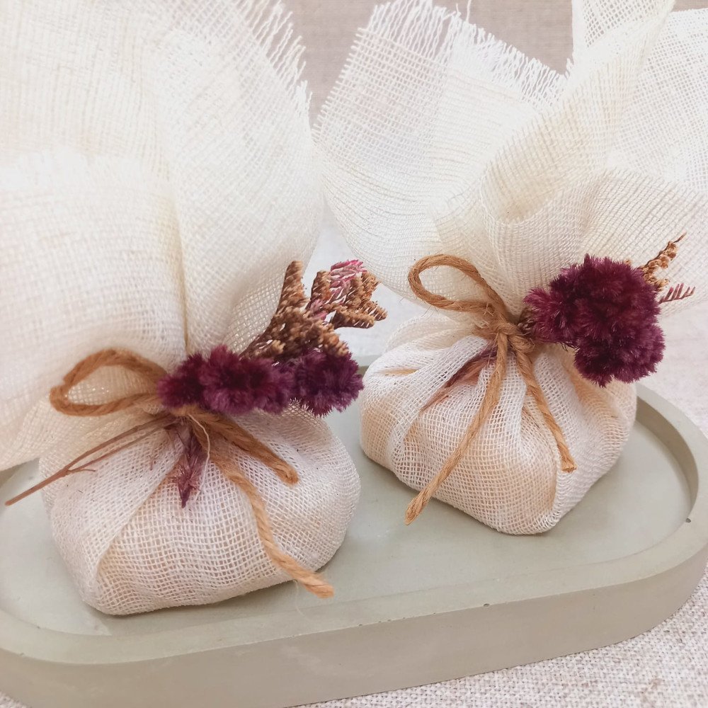 Produzidos com base glicerinada vegetal, nossos sabonetes são elaborados artesanalmente e finalizados com embalagem em tecido leve, fio rústico e flores secas naturais, além de tag personalizada com nome e data do evento.