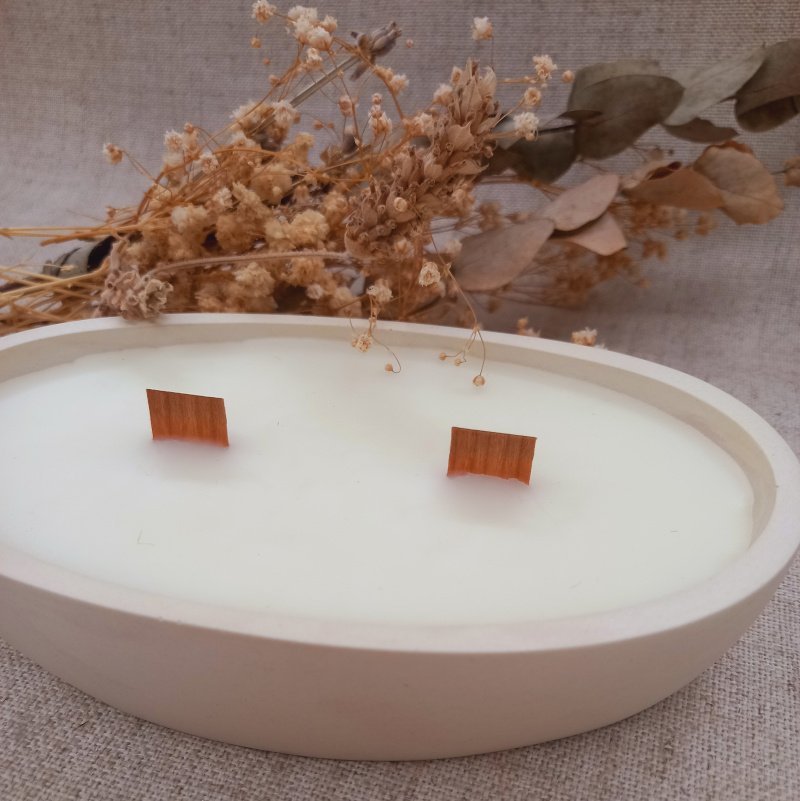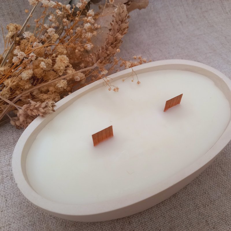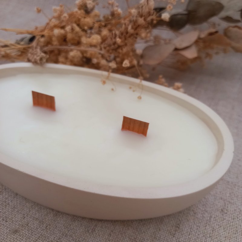 Produzida artesanalmente, esta vela em recipiente oval em ecomármore traz dois pavios de madeira, que proporcionam uma queima uniforme e um leve crepitar, criando uma atmosfera sensorial única.